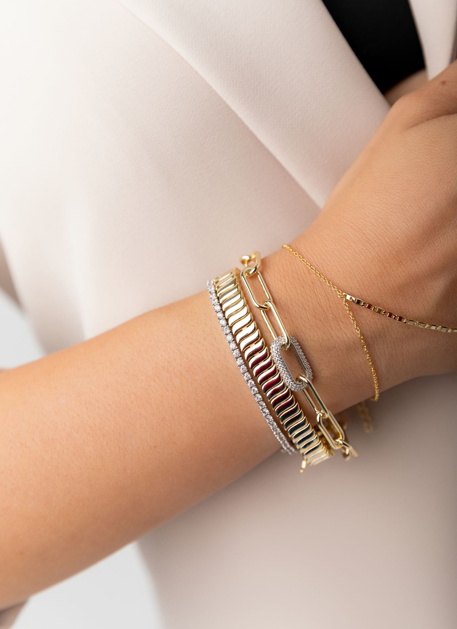 The Remi Bracelet is a bold yet timeless piece, featuring sleek, polished links for a sophisticated finish. Its classic elastic design makes it perfect for everyday wear or layering with your favorite stacks. Whether dressed up or down, the Remi Bracelet is a statement of effortless elegance.